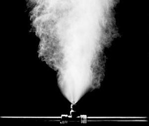 人造雾喷嘴有两大类,常规的是离心式喷嘴,用激光在一块超硬特殊合金上钻孔,并在小孔后面设有不锈钢精密小活塞,在高压水流的驱动下,小活塞高速运动,将水撕裂成极细的水滴,经小孔喷出成雾。