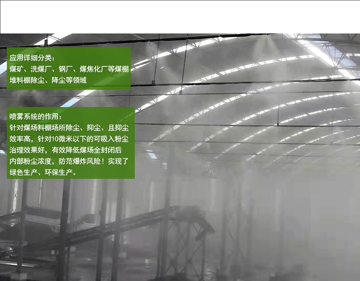 当水雾颗粒与尘埃颗粒直径大小相近时,行程的吸附过滤、凝结的几率较大,那么只要产生于粉尘颗粒大小相当的微米级水雾颗粒使其与之吸附,相互粘结,聚集增大并在自身重力的作用下沉降,就可达到降尘的目的,当水雾形成时产生负离子,粉尘中大量的正离子与水雾中的负离子结合,从而迅速降尘,水雾与干燥的粉尘解除,增加了空气的湿度,同时吸收空气潜热,从而起到良好的降温作用,水雾降尘技术产生的水雾颗粒大小主要集中在10-100微米左右,对100微米以下的粉尘具有较强的降尘效果,从而在污染源头即可控制。