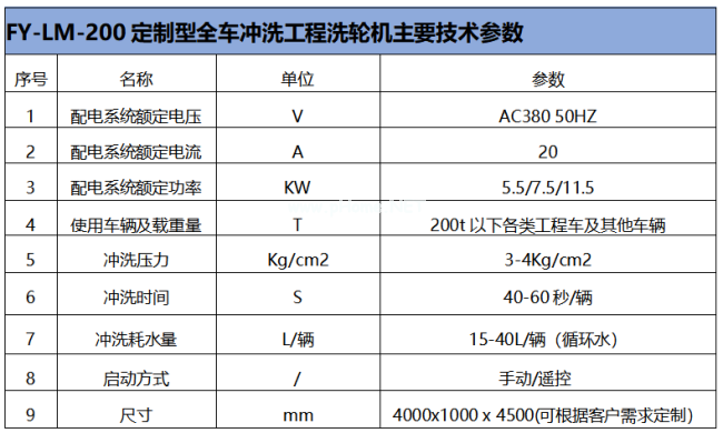 FY-LM-200型定制型全车冲洗工程洗轮机:工程全自动洗轮机,车辆自动冲洗机是依据市政、路政、建委、环委、交通等各部门对工程车辆的要求下,对各类工程车辆轮胎及底盘而设计,该设备是利用多方位高压水枪对轮胎及底盘部位进行高压冲洗,从而达到将车轮及底盘彻底洗净的效果,达到各部门的上路要求,枫叶洗轮机采用红外对射自动感应 式、追控和手动三种控制,可自动完成冲洗工作,冲洗用水可循环使用连续工作时,仅需补充少量的水,因此可以节约大 量水资源。特别适用于各类建筑工地、矿业工场、水泥制品厂、煤矿、发电厂、垃圾填埋厂、高品质社区等场所的进出车辆清洗。从而达到无粉尘污染的优良工程。该设备安装运输方便,可适用各种工地频繁转厂的需要。