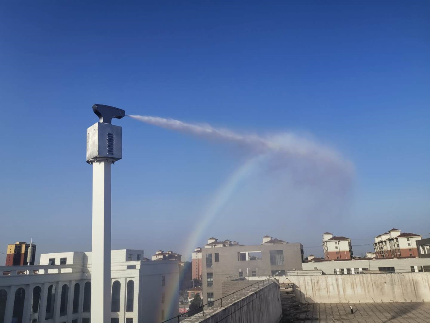 雾桩针对室外扬尘特性研发,采用高压水射流技术,通过主机将水加压至高压,再通过高压喷嘴进行雾化和喷射,雾化颗粒在100um到15Oum之间,即可保证水滴在室外环境下不至于快速蒸发,有效地进行抑尘降尘,又不会造成抑尘区域积水。
