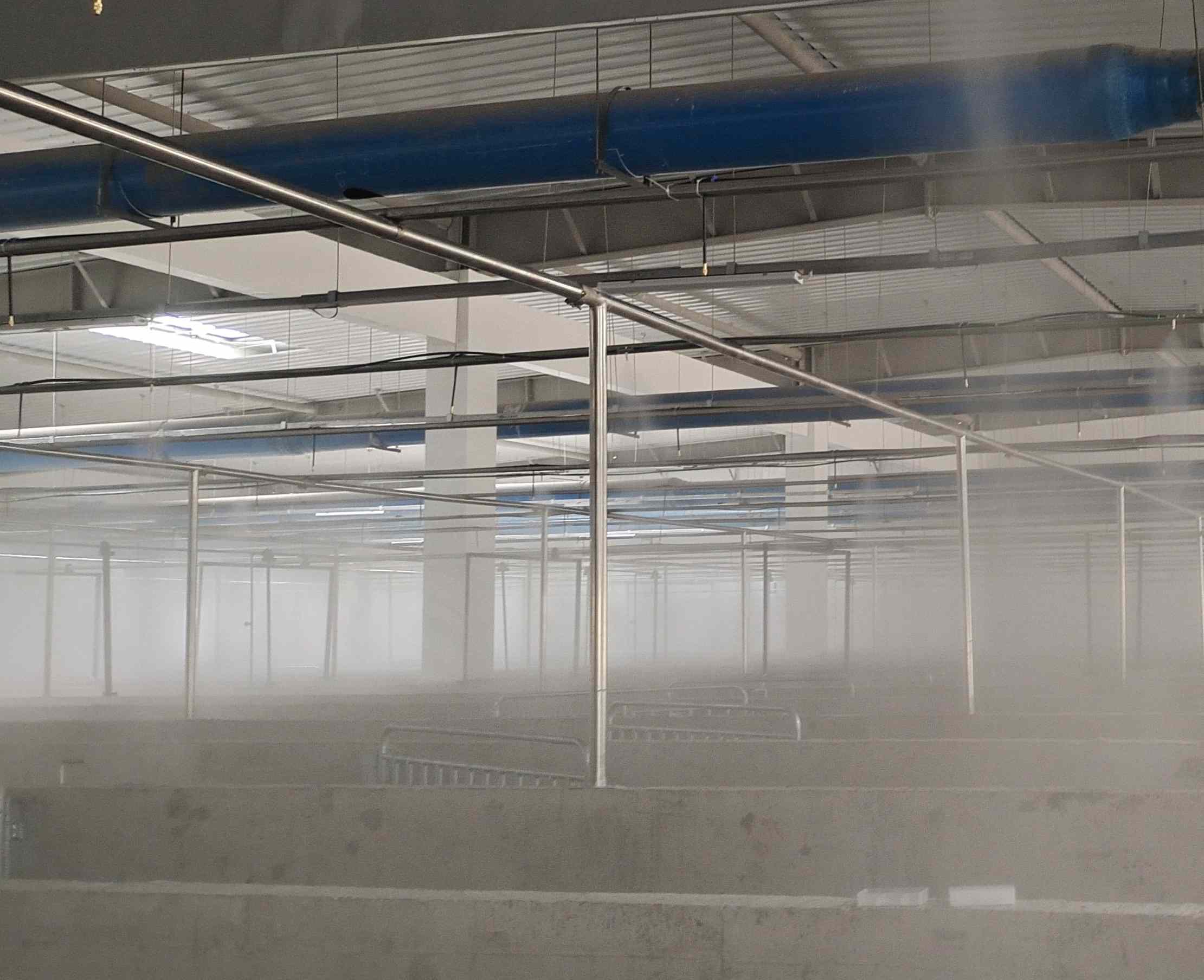 在猪舍内、通风管道或者室外等位置安装高压喷雾系统,设备的选择需要根据实际情况进行。要注意喷头的数量和位置以及水雾的喷射量等参数的设置。