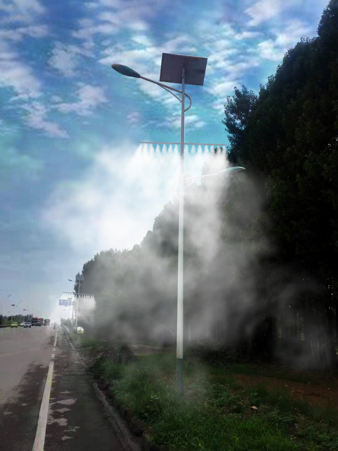 路灯上的喷雾是高压喷淋降尘系统这种系统通过高压泵将水加压后,经高压管道输送至高压雾化喷嘴进行雾化,形成微米级的水雾颗粒。这些水雾颗粒能够吸附空气中的浮尘和颗粒物,有效降低环境中的PM2.5、PM10浓度,改善空气质量。系统通常设置远程控制器,可使用程序远程控制,实现自动喷雾降尘除霾。此外,路灯喷雾系统还具备防暑降温功能,通过喷洒细小的水雾颗粒,增加空气湿度,降低周围环境温度,提高行人和车辆的舒适度。这种系统不仅节能环保,而且操作简便,是智慧城市道路扬尘治理的新产品,有助于城市环保发展。。。