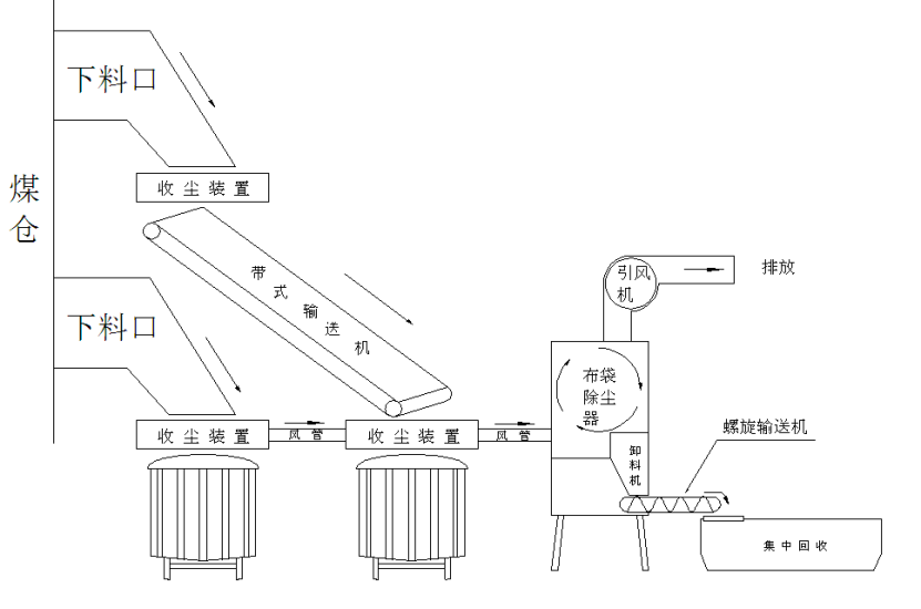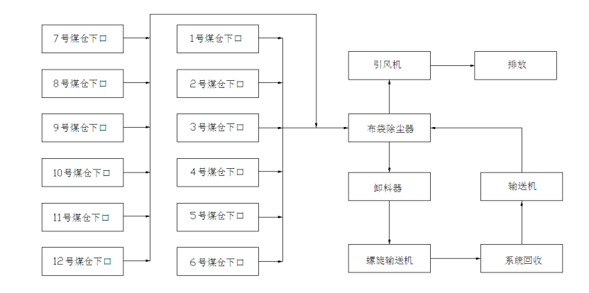 收尘系统整体布局采用集中风网设计,12个煤仓下料口及带式输送机头、尾均布置收尘装置,集中汇集进布袋除尘器当中过滤,粉尘颗粒通过卸料器进入螺旋输送机,螺旋输送机把粉尘颗粒送进集中回收站里。